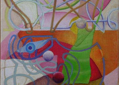 A homage to a parted friend. This is the final version; an early version surprised me with echoes of a painting by Poussin. The companion piece, as if viewed from within the main painting, was mapped out in 2020 but not painted until February 2025 and as of March is not the final state.